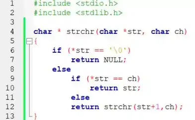 Agora, caso isso não ocorra, passamos para o último else, onde vamos fazer uma chamada recursiva à nossa função strchr, dessa vez incrementando o parâmetro str. Ao fazer isso, fazemos a função analisar cada caractere de str, como se estivéssemos dentro de um laço for!
