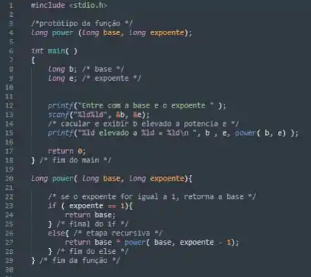 Como no exercício teremos que calcular a exponenciação, por exemplo, power( 3, 4 ) = 3 * 3 * 3 * 3. Onde 3 é a base e 4 é o expoente. Podemos criar uma função que faça a base * power (base, expoente – 1). Ou seja, a função chamando-a até que o expoente seja igual a 1.