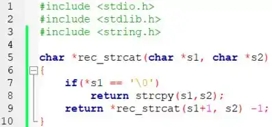 Logo de cara, vamos abrir uma condição if para que, caso a primeira string seja vazia, simplesmente copiamos a segunda para ela por meio da função strcpy. Agora, caso s1 não seja uma string vazia, passamos para a linha 9, que é onde entra em jogo a recursividade. Ali, fazemos uma chamada recursiva da função rec_strcat, passando como parâmetros o endereço seguinte ao presente em s1 por isso retiramos uma unidade ao final, para se obter o endereço original de s1.