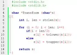 Dentro desse laço, iniciamos uma condição if para verificar se o índice i está na primeira ou segunda metade da string. Caso esteja na primeira, usamos a função tolower para definir o caractere s[i] como minúsculo. Caso esteja na segunda metade, usamos toupper para defini-lo como maiúsculo.