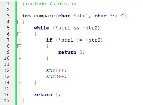 Essa função, que chamei de compare, recebe duas strings como parâmetros e passa pelos caracteres de cada uma por meio de um while. Dentro desse loop, iniciamos uma condição if para analisar se os caracteres analisados diferem. Caso isso ocorra, retornamos 0, que significa “falso”, caso o while passe por toda a string e não encontre caracteres diferentes, retornamos 1, que significa “verdadeiro”.