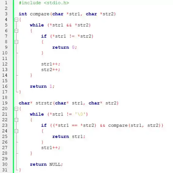 Caso ambas as condições sejam satisfeitas, passamos para a linha 25, que irá retornar str1 a partir da posição em que str2 foi encontrada. Caso nada disso ocorra, retornamos NULL lá no final.