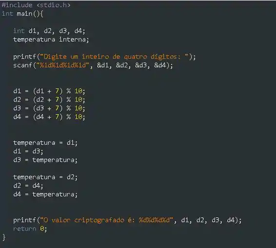Por fim, exibiremos os valores criptografados e indicaremos que o programa foi finalizado com sucesso, colocando o valor de retorno da função main.