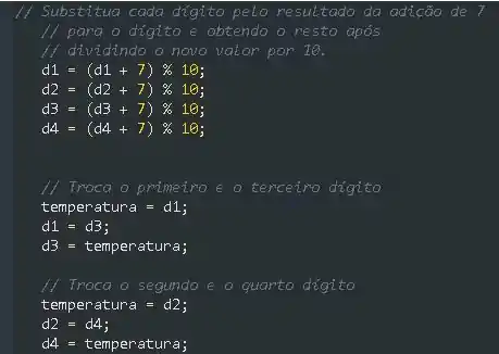 Impondo privacidade com criptografia. O crescimento explosivo das comunicações pela Internet e do armazenamento de dados nos computadores conectados à Internet aumentou muito a preocupação com a privacidade. O campo da criptografia trata da codificação de dados para torná-los difíceis (ou impossíveis, com os esquemas mais avançados) de serem lidos por usuários não autorizados. Nesse exercício, você investigará um esquema simples de codificação e decodificação de dados. Uma empresa que queira enviar dados pela Internet lhe pediu que escrevesse um programa que os codificasse para que pudessem ser transmitidos com mais segurança. Todos os dados são transmitidos como inteiros de quatro dígitos. Sua aplicação deverá ler um inteiro de quatro dígitos informado pelo usuário e codificá-lo da seguinte forma: substitua cada dígito pelo resultado da soma de 7 ao dígito e calcular o módulo depois de dividir o novo valor por 10. Depois, troque o primeiro dígito pelo terceiro e troque o segundo dígito pelo quarto. A seguir, imprima o inteiro codificado. Escreva outra aplicação que receba um inteiro de quatro dígitos codificado e o decodifique (invertendo o esquema de codificação) para formar o número original. [Projeto de leitura opcional: pesquise ‘criptografia de chave pública’ em geral e o esquema de chave pública PGP (Pretty Good Privacy) específico. Você também poderá querer investigar o esquema RSA, que é bastante usado em aplicações de peso industrial.]