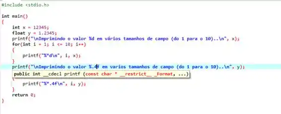 Impressão de números em diversas larguras de campo. Escreva um programa que teste os resultados da impressão do valor inteiro 12345 e o valor de ponto flutuante 1.2345 em diversos tamanhos de campo. O que acontece quando os valores são impressos em campos que contêm menos dígitos do que os valores?