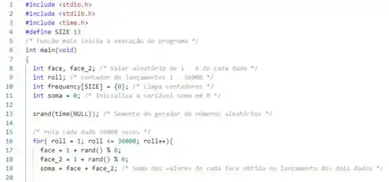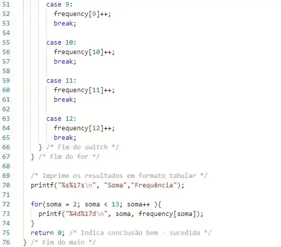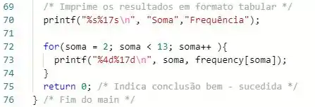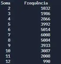 E por fim, imprimimos nosso resultado bem bonitão, mas para isso utilizamos um for para ler os dados do nosso array, onde armazenamos a frequência em que cada soma aparece e depois usamos o famoso printf para exibir esses resultados em formato tabular para o usuário. :)