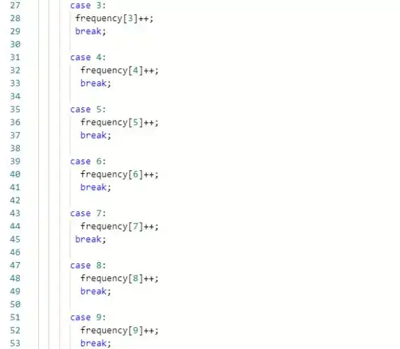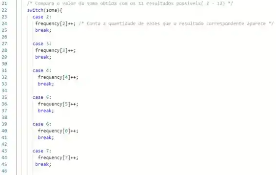 Depois de feitas as somas é preciso armazenar as frequências com que aparecem cada resultado, como são dois dados os resultados variam de 2 - 12. E para fazer esse armazenamento em nosso array frequency usamos o comando switch para comparar cada valor de soma com todos os possíveis resultados. Dá uma trabalheira fazer isso 11 vezes, porém não desiste!