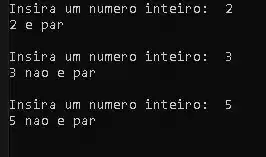 Par ou ímpar. Escreva um programa que inclua uma série de inteiros e os passes um de cada vez à função even, que usa o operador de módulo para determinar se um inteiro é par. A função deverá usar um argumento inteiro e retornar 1 se o inteiro for par, e retornar 0 se o inteiro for ímpar.
