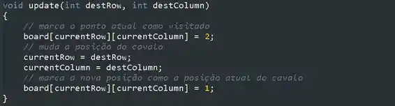 A função de atualização marcará o local atual do cavaleiro como visitado e marcará o novo local como atual. Também mudará a posição das variáveis currentRow e currentColumn do cavaleiro.