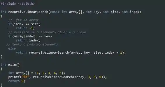 Vamos definir a função recursiveLinearSearch que receberá o array, o tamanho do array, a chave e um índice. O índice começa em 00, correspondente ao primeiro elemento. Pesquisaremos recursivamente no array adicionando 11 ao índice em cada chamada. Se o índice se tornar igual ao tamanho do array terminaremos as chamadas recursivas e retornaremos -1. Mas, se a chave for encontrada, retornaremos o índice.