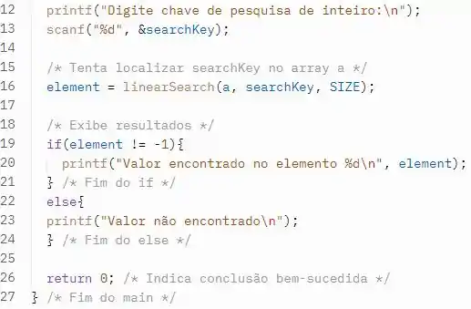 Ainda no main, perguntamos ao usuário que número ele gostaria de verificar se está no nosso array, e guardamos esse número na variável searchKey como já havíamos mencionado. Em seguida, a variável element fica responsável por guardar o retorno da nossa função linearSearch. E depois, utilizamos os operadores condicionais if/else para exibir mensagens ao usuário de acordo com o valor de element, caso seja -1 será exibido a mensagem que o valor não foi encontrado, porém se for diferente de -1 será impresso a posição onde ele se encontra.