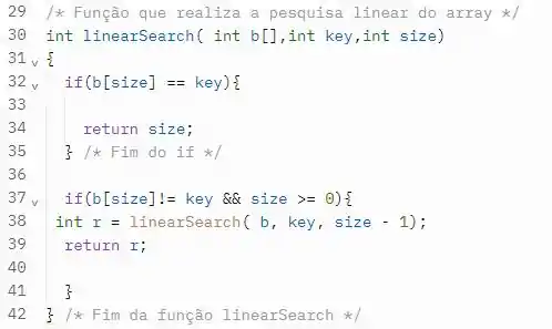 Seguimos para a função linearSearch, cujos parâmetros são o nosso array, a chave a ser pesquisada e o tamanho do nosso vetor. Dentro da função comparamos se a última posição é a nossa chave, caso não seja então fazemos a chamada novamente da mesma função, por isso é uma função recursiva. A cada chamada o tamanho tem que sofrer um decréscimo para que cada elemento do array seja comparado com a nossa chave. E por fim, se o valor for encontrado, esse é retornado para o main, caso contrário é retornado o -1.