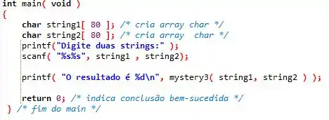 Aqui temos o nosso main, que declara os arrays do tipo char e pede aos usuários que escreva duas strings de sua preferência. Logo em seguida ele chama a função mystery3, convertendo as strings para os ponteiros e retorna seu resultado.