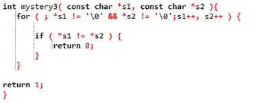 Na função mystery3 foi desenvolvido um loop do tipo for que rodará enquanto os dois ponteiros *s1 e *s2 forem diferentes de nulo. E dentro dele, temos uma função de condição if que compara os dois ponteiros que retorna 0 se os mesmos forem diferentes.