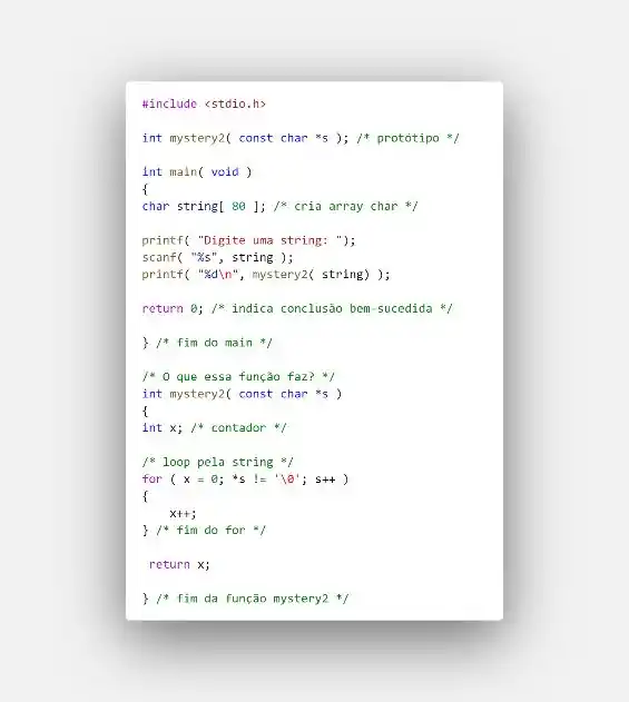 Este programa vai encontrar o comprimento da string. A string está sendo inserida pelo usuário na função principal e então a função mystery2 é chamada. A função da mystery2(const char *s) é calcular o comprimento da string um por um com a ajuda do loop for. Depois de computado todo o comprimento da string, ele retorna o comprimento da string na função principal e, em seguida, exibe o comprimento da string no console.