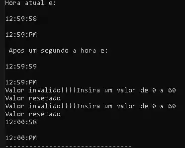 Nosso programa também terá que fazer o tratamento de erro, caso os horários definidos estejam fora do padrão. Por exemplo definir um valor para horas, minutos e segundos negativos.