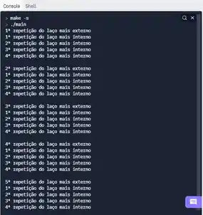 Então, o que rola é o seguinte: quando eu tenho laços aninhados, é que eu vou executar o laço mais interno todo n vezes, até já ter se esgotado todas as repetições do laço mais externo. Isso vai ser muuuito útil, principalmente quando formos trabalhar com matrizes.