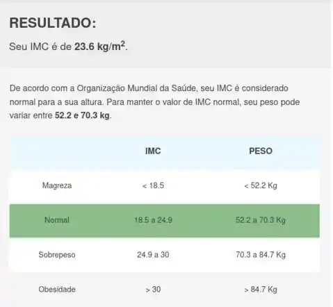 Os dados utilizados para calcular o IMC geralmente são altura e peso. Fazendo uma relação simples de [peso (kg) / (altura (m)altura( m))]. Alguns pontos que você pode observar a respeito do IMC:Magreza, quando o resultado é menor que ;