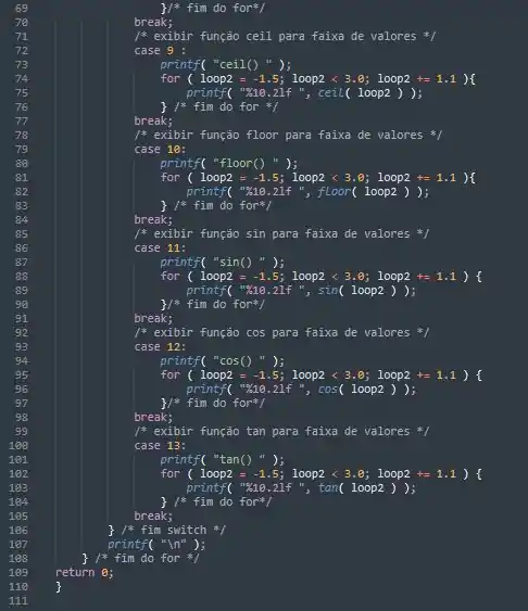 Agora que sabemos como é a instrução para cada função, vamos colocar cada uma delas dentro do nosso programa. Podemos utilizar o comando switch() e criar um case para cada função. Nas funções sqrt(), exp(), log(), log10(), pow(2,x) vamos usar um loop para os valores de 1 até 5. E nas funções fab(), ceil (), floor(), sin(), cos(), tang() vamos usar os valores de -1.5 até +1.1. Desta forma ficará mais fácil de analisar o que cada função retorna. Em cada case vamos imprimir os valores dos resultados para função e construir uma tabela para facilitar a visualização: