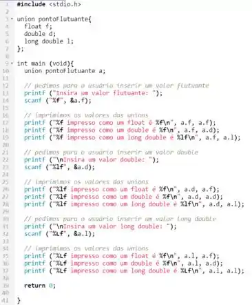Uso de uniões. Crie a união pontoFlutuante com membros float f, double d e long double x. Escreva um programa que aceite valores do tipo float, double e long double, e armazene os valores em variáveis de união do tipo union pontoFlutuante. Cada variável de união deverá ser impressa como um float, um double e um long double. Os valores sempre são impressos corretamente?