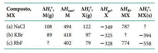 Complete a seguinte tabela (todos os valores estão em quilojoules por mol).