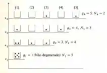 Nessa questão do livro de termodinâmica de Sears cinco partículas estão distribuídas entre os estados dos quatro níveis de energia igualmente espaçados, mostrados na Figura , tais que a energia total e . Calcule a probabilidade termodinâmica de cada macroestado e o número de ocupação médio de cada nível. se as partículas obedecem a estatística.